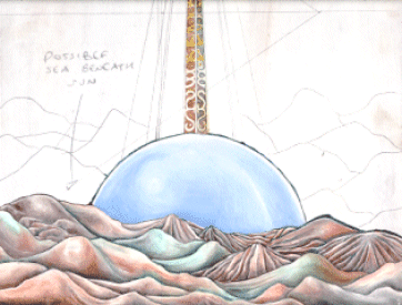 Ok - let's have an unfinished lunar landscape... with a giant blue dome... and an obelisk in the middle...